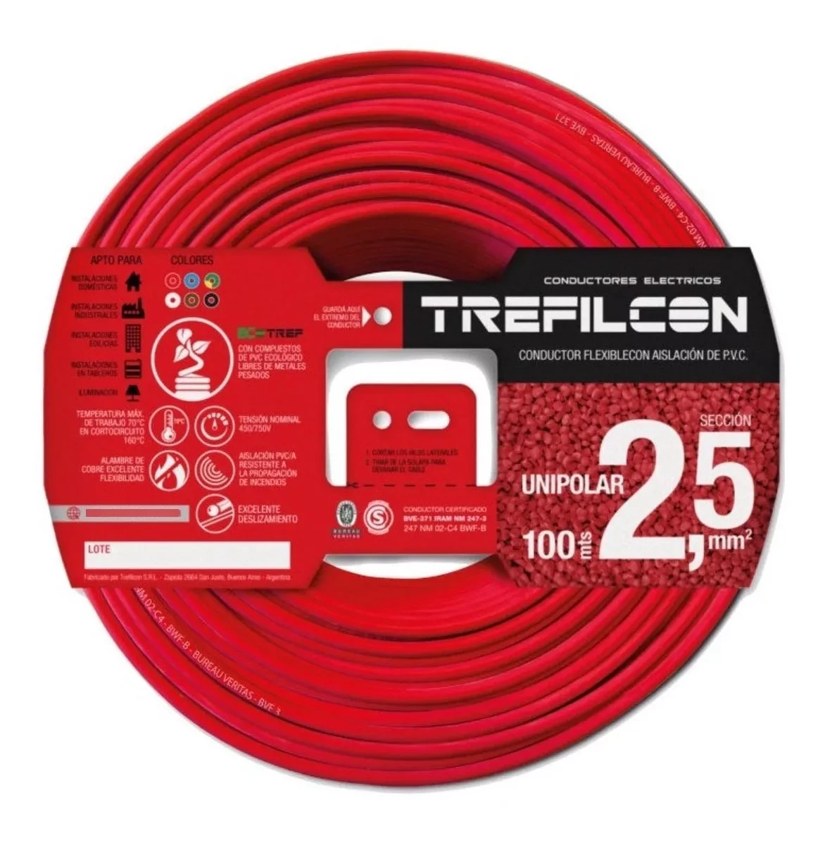 Aislación: Compuesto termoplástico de PVC tipo BWF (resistente a la propagación de llama). Cuenta con excelentes prestaciones mecánicas, eléctricas, flexibles, deslizantes y es ecológico libre de metales pesados.