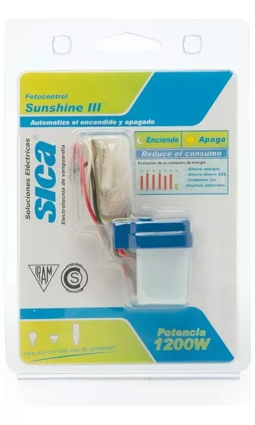Independizate de prender las luces cuando oscurece! Con el fotocontrol Sunshine III de Sica automatizá esta tarea. Este sensor electrónico controla la conexión y desconexión de los artefactos de iluminación, permitiendo el ahorro y uso racional de energía. A través del cambio del nivel de iluminación natural o artificial, el fotocontrol mantendrá las luces encendidas sólo cuando sea necesario. Posee una cubierta resistente a los rayos UV, al impacto y otorga un mínimo envejecimiento frente a factores ambientales. Cuenta con un dispositivo de retardo contra iluminaciones esporádicas. De fácil conexionado, funciona con todo tipo de lámpara. Potencia 1200W. Grado de protección IP33. Certificación IRAM.